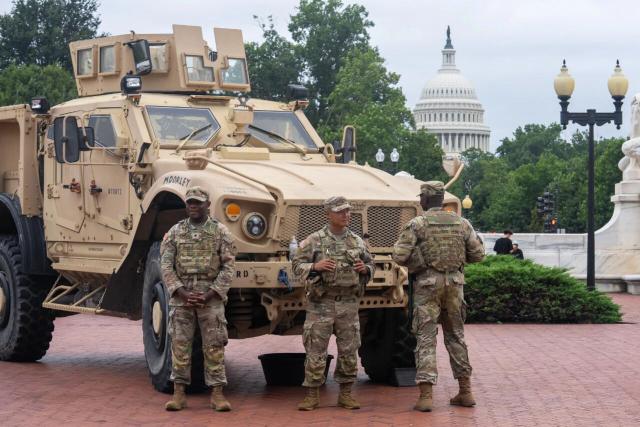 这是 8 月 19 日在美国首都华盛顿的联合车站外拍摄的国民警卫队成员和车辆。(新华社)