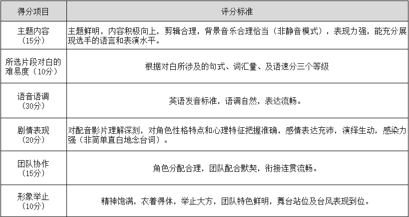 根据配音队伍现场表现进行综合研议,研议标准如下表:
